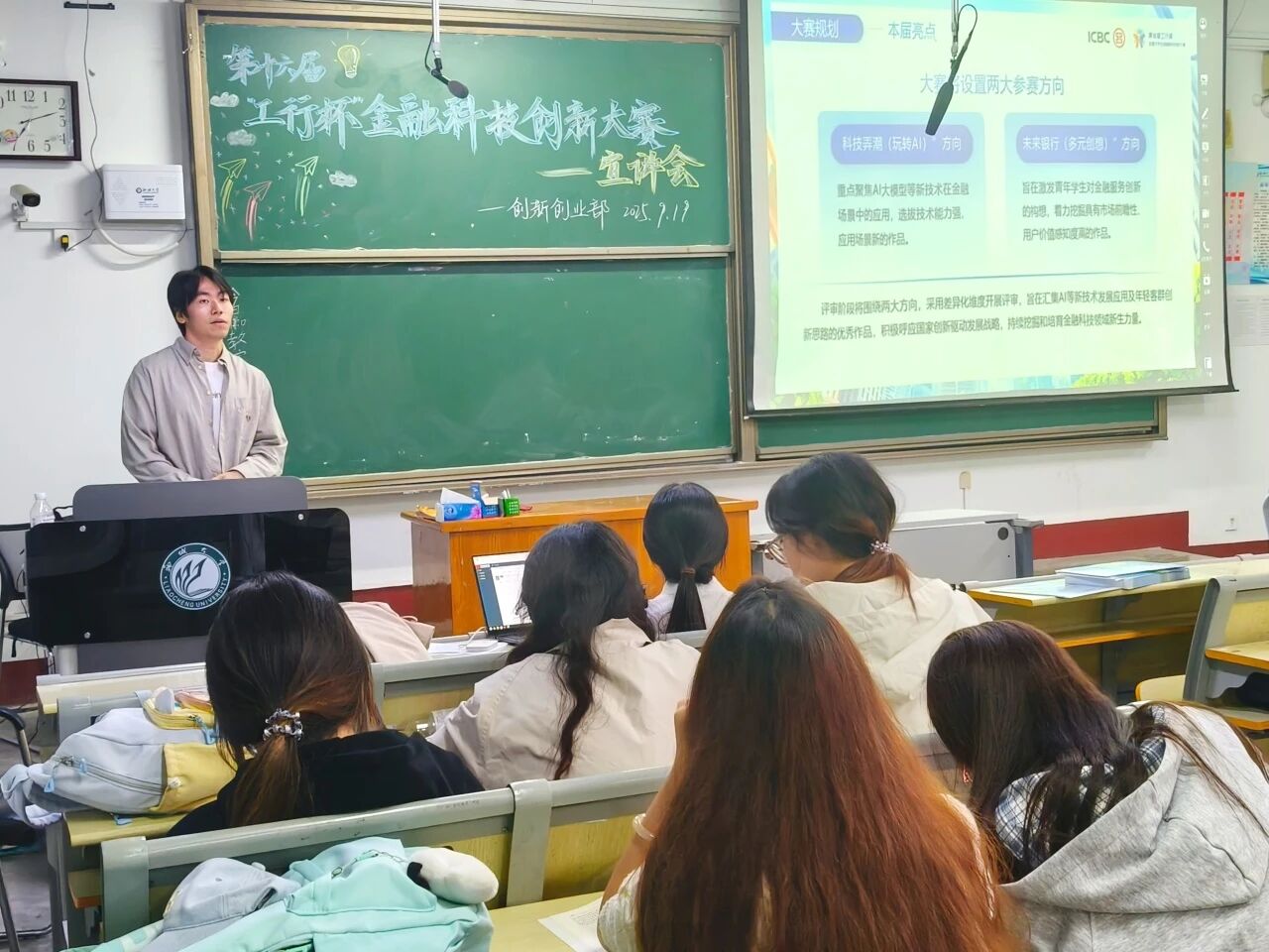 为助力学子把握金融科技创新赛事机遇,激发创新创业活力,9月19日,十大正规外围买球平台创新创业部于1号教学楼301室举办第十六届“工行杯”全国大学生金融科技创新大赛宣讲会,聊城分行工商银行金融科技部经理一级孙泽龙、王莹受邀担任主讲人,全方位解读大赛细则。