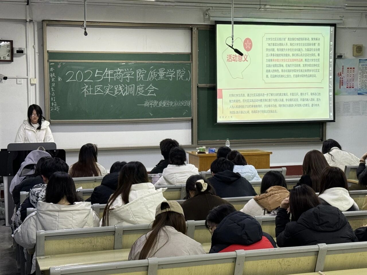 会上,社会实践部工作人员高均卓系统总结了上学期学院大学生社区实践成果,并从选题策划、方案设计、沟通协调等方面对新学期社区实践工作作出部署。她指出,实践选题需紧密结合质量监控、供应链管理等商科专业特色,同时聚焦社会热点,重点围绕教育帮扶、文化传承、空间建设、便民服务、创业实践、文体活动、人物访谈、项目调研八大类实践活动展开,建立“社区负责人-指导教师-学生团队”三方沟通机制,根据反馈动态优化方案。